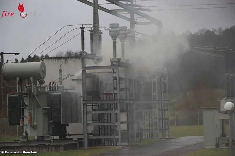 KONSTANZ (DEUTSCHLAND): Um 12:06 Uhr des 24. Dezember 2019 wurde der Feuerwehr Konstanz ein Brand auf dem Gelände eines Umspannwerks am Rand von Konstanz gemeldet. Die ersten Einsatzkräfte stellten vor Ort eine starke Rauchentwicklung an einem der Transformatoren an der 110-kV Leitung fest.