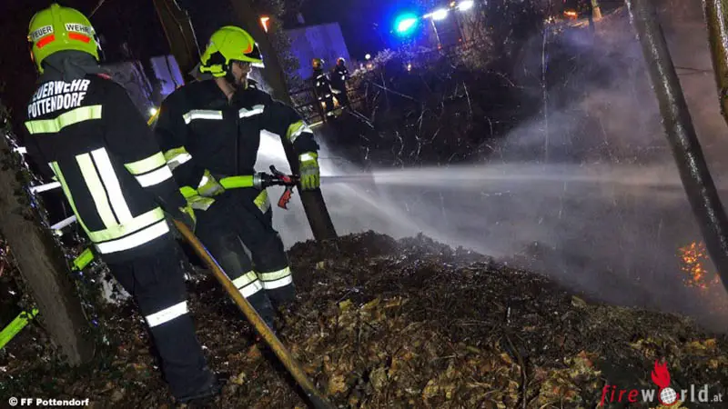 Bereits nur wenige Minuten später um 00.14 Uhr wurde bei der Bezirksalarmzentrale von der Polizeileitstelle ein Heckenbrand in Pottendorf gemeldet. Anrainer waren auf den Feuerschein bei einer Brücke im Waldbereich des Werkskanals Ecke Spinnereipark aufmerksam geworden und hielten Nachschau. Als die alarmierte Freiwillige Feuerwehr Pottendorf kurze Zeit später eintraf, standen mehrere Quadratmeter der dortigen Böschung direkt neben dem Werkskanal in Brand und die Flammen erfassten bereits auch einige Bäume.