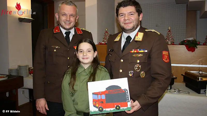 Auch der Tagesordnungspunkt Neuaufnahmen brachte Neues. Die neujährige Viktoria Maria Gratzer trat als erstes weibliches Mitglied der Feuerwehr Bildein bei. Um ihre Freude zu zeigen überreichte sie als Einstandgeschenk dem Kommandanten ein selbstgemaltes Bild des Tanklöschfahrzeuges.