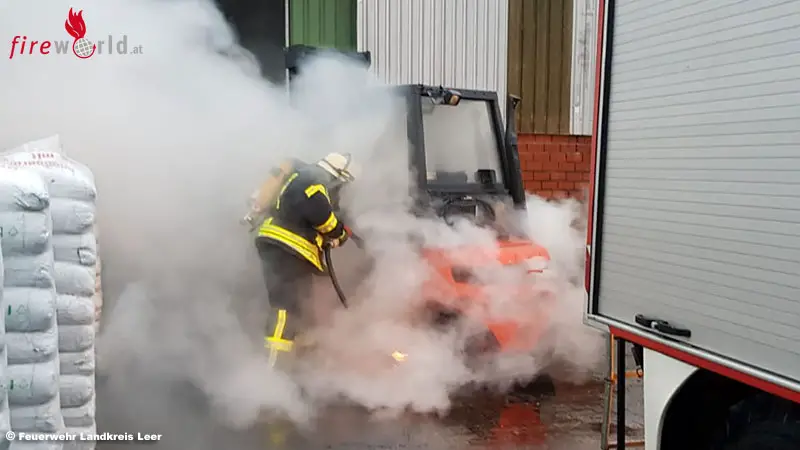 VÖLLENERFEHN (DEUTSCHLAND): Die Feuerwehren aus Völlenerkönigsfehn und Völlenerfehn mussten am Mittwochvormittag, 8. Jänner 2020, zu einer Lagerhalle am Dwarsweg ausrücken. Um kurz nach 08:30 Uhr war in der Halle ein Gabelstapler in Brand geraten.