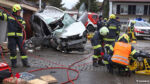 Die Einsatzkräfte mussten nach einer ersten Versorgung sowie ersten Sicherungsmaßnahmen, das Unfallwrack mittels Seilwinde von der Garage ein Stück wegziehen, dann konnte der Beifahrer unter Einsatz von insgesamt vier hydraulischen Rettungsgeräten aus dem Unfallwrack geschnitten werden.