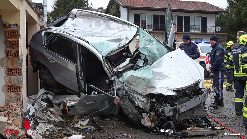 Der Lenker wurde bei dem Unfall leicht verletzt, er war nicht eingeklemmt und konnte von den Einsatzkräften rasch aus dem Fahrzeug befreit werden. Äußerst schwierig gestaltete sich jedoch die Rettung des eingeklemmten Beifahrers. Weil das Auto mit derart großer Wucht gegen die Garage prallte, war die Person schwer eingeklemmt.