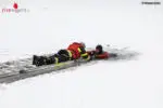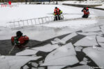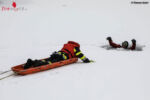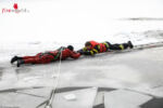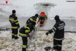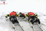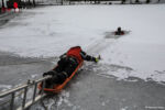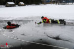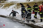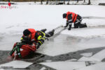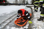 Beim zweiten Szenario wurde eine bewusstlose Person simuliert, die über Steckleitern über das Eis an das rettende Ufer gebracht werden musste. Neben der schnellen Rettung der Person wurde ein besonderes Augenmerk auf die Eigensicherung der auf dem Eis agierenden Feuerwehrmänner gelegt, so Brandinspektor Marvin Renner, der diese Übung ausgearbeitet hatte.