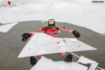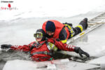 Ausgerüstet mit einem Trockentauchanzug wagten sich der Feuerwehrtaucher von der Feuerwehr Apfelberg in das nur wenige Grad kalte Nass und simulierten eine im Eis eingebrochene Person. Da die Person beim Eintreffen der Einsatzkräfte „ansprechbar“ war, wurde als erstes Übungsszenario dem Verunfallten eine Rettungsleine zugeworfen, mit dem er aus dem Wasser über das Eis an Land gezogen werden konnte.