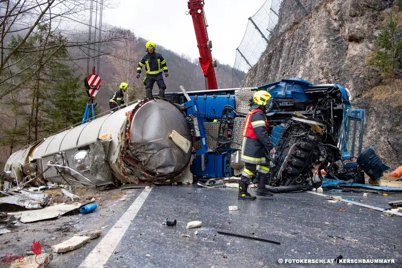 Der mit 25.000 Liter Milch beladene Sattelschlepper ist frontal gegen die Felswand an der B115 in Fahrtrichtung Weyer geprallt. Das Fahrerhaus ist dabei abgerissen und der Auflieger seitlich liegend zum Stillstand gekommen. Für den Lenker kam jede Hilfe zu spät. Die B115 musste zur Gänze gesperrt werden. Nach rund sechs Stunden konnten die Aufräumarbeiten abgeschlossen werden.