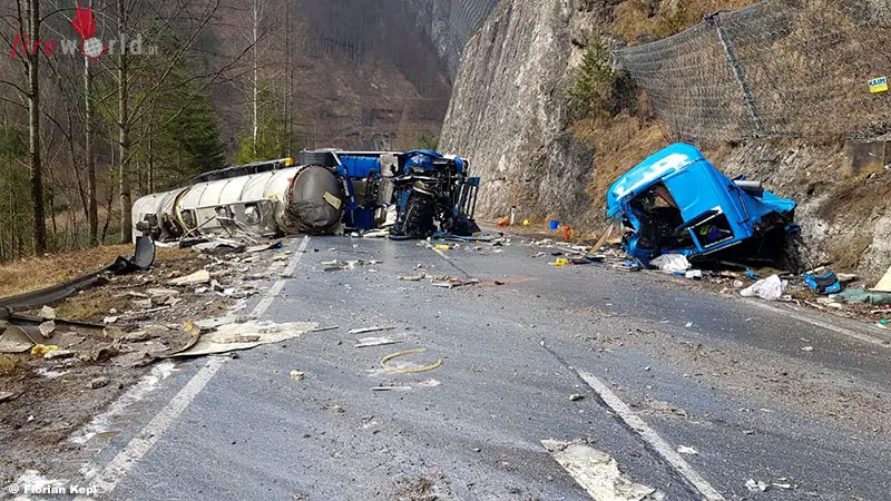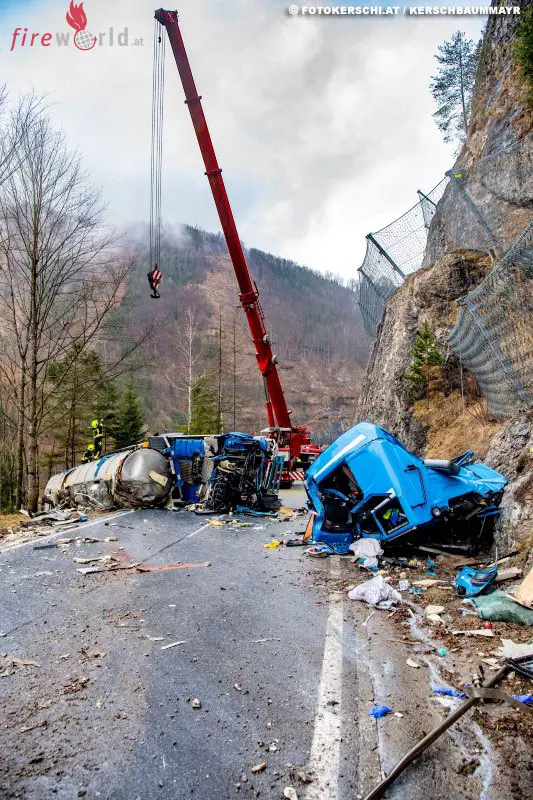 Der mit 25.000 Liter Milch beladene Sattelschlepper ist frontal gegen die Felswand an der B115 in Fahrtrichtung Weyer geprallt. Das Fahrerhaus ist dabei abgerissen und der Auflieger seitlich liegend zum Stillstand gekommen. Für den Lenker kam jede Hilfe zu spät. Die B115 musste zur Gänze gesperrt werden. Nach rund sechs Stunden konnten die Aufräumarbeiten abgeschlossen werden.
