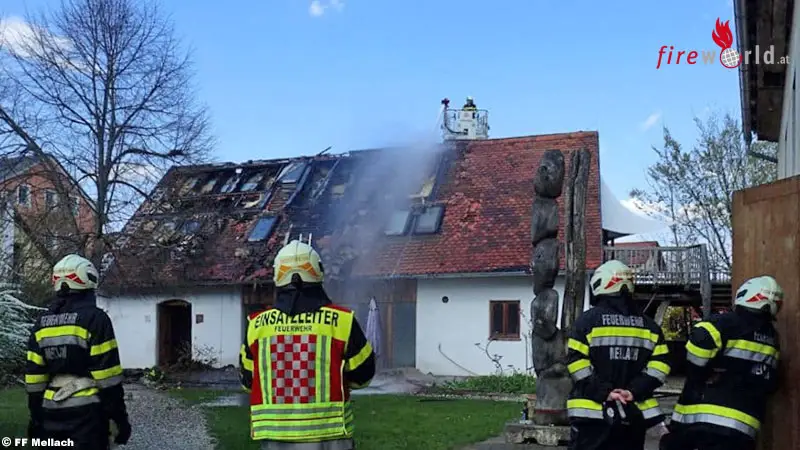 FERNITZ-MELLACH (STMK): Am Ostersonntag, dem 12. April 2012, kam es in Mellach, Ortsteil Enzelsdorf, zu einem Wohnhausbrand. Die ortszuständige FF Mellach wurde um 11:58 Uhr mit dem Alarmstichwort „B05-Zimmerbrand im ersten Obergeschoß“ zeitgleich mit den Feuerwehren Fernitz und Kalsdorf alarmiert.