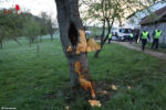 Aus unbekannter Ursache kam der Pkw auf das rechte Straßenbankett, kam ins Schleudern, schlitterte über die Fahrbahn und kam links von der Fahrbahn ab. Der Pkw rutschte 90 Meter über die angrenzende Wiese und prallte mit großer Wucht mit dem Heck gegen einen Obstbaum.