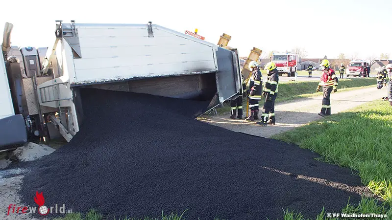Der Lenker eines mit Asphalt beladenen Mulden-LKW war samt Tiefladeanhänger auf der Bundesstraße 36 von Vitis kommend in Richtung Waidhofen/Thaya unterwegs. Auf Höhe von Götzweis kam es nach Angaben des Fahrers zu einem Reifenplatzer am linken Vorderrad. Der Lenker konnte das Schwerfahrzeug nicht mehr auf der Straße halten, querte die Gegenfahrbahn und stürzte in den linken Straßengraben. Der Lkw kippte dabei auf die linke Seite und ein Teil der Ladung wurde aus der Mulde geschleudert. Ein zufällig vorkommendes Mitglied der Feuerwehr Dobersberg kümmerte sich sofort um den verletzten Fahrer und half ihm aus der Fahrerkabine. Der Verletzte wurde vom Roten Kreuz Waidhofen/Thaya erstversorgt und anschließend ins Landesklinikum Horn abtransportiert.