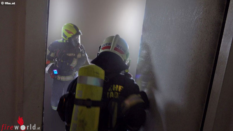 Zwischenzeitlich war bereits eine gefüllte Löschleitung von den weiteren eingetroffenen Feuerwehreinsatzkräften ins zweite Obergeschoß aufgebaut und ein Hochleistungslüfter im Eingangsbereich des Stiegenhauses in Stellung gebracht worden. Dann ging alles sehr schnell – die versperrte Wohnungs-Eingangstüre wurde gewaltsam aufgebrochen und ein Atemschutztrupp drang mit gefüllter Löschleitung ins Innere vor.