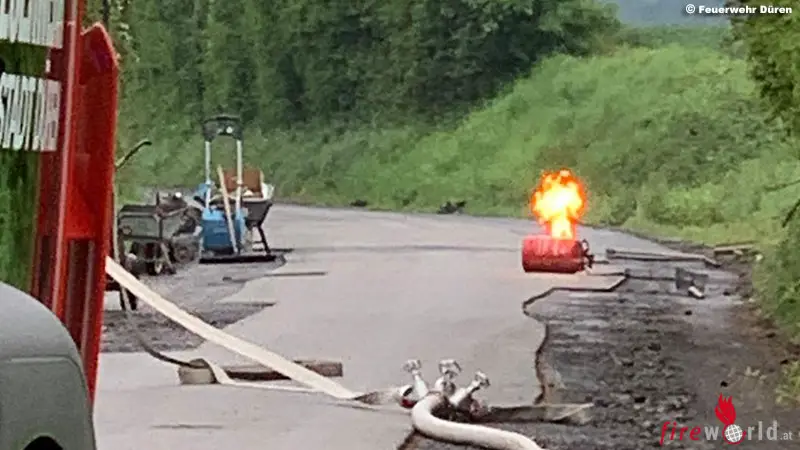Die Feuerwehr sicherte mit einem Wasserwerfer aus sicherer Entfernung die Einsatzstelle, dabei konnte ein Trupp unter Atemschutz die Gasausströmung abschiebern. Die Gasflasche wurde anschließend von der Feuerwehr gekühlt und mit einem Gasmessgerät überprüft. Im Einsatz waren neben der hauptamtlichen Wache, die Löschgruppen Lendersdorf und Niederau mit insgesamt rund 24 Einsatzkräfte.