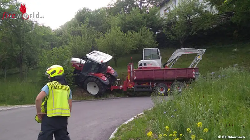 BIBERBACH (NÖ): Kurz nach 18:00 Uhr wurde die Feuerwehr Biberbach am Samstagabend, 9. Mai 2020, zu einer Fahrzeugbergung auf die Landesstraße L6200 im Bereich Gstadthof gerufen. Aus der Alarmierung war bereits zu entnehmen, dass es sich um einen Traktor handelte und dieser umzustürzen drohte.