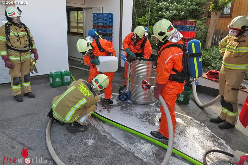 Während die Kameraden aus Jenbach noch auf Anfahrt waren, erkundete ein Atemschutztrupp aus Stans vorsichtig die Lage im Raum und konnte zum Glück keinen Brand feststellen, jedoch wurde die Tür zum Raum sofort wieder geschlossen und auf die Spezialisten gewartet. Diese führten sogleich eine Messung durch und stellten erhöhte CO2-Werte sowie einige stark erwärmte Kanister fest. In Absprache mit dem Bezirkschemiker machte sich ein Trupp der Feuerwehr Jenbach unter Schutzstufe 2 auf den Weg, um die Behälter zu bergen.