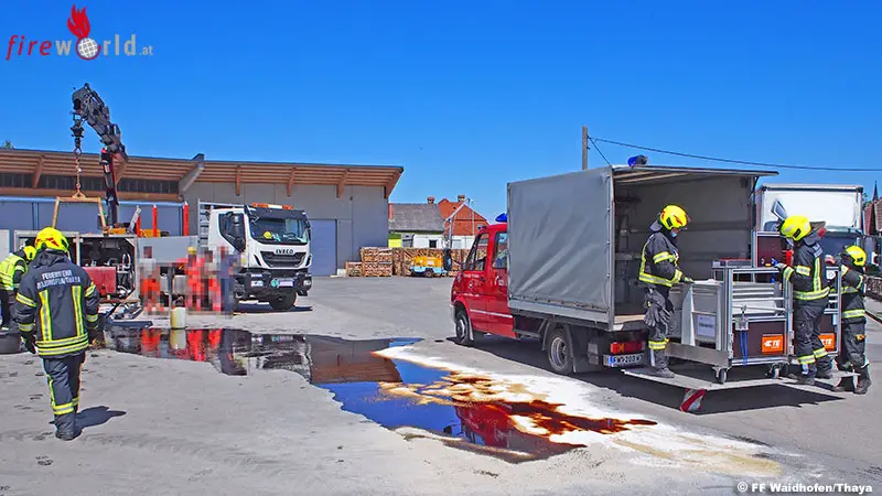 WAIDHOFEN AN DER THAYA (NÖ): Während Bohrungsarbeiten am Gelände des Raiffeisen Lagerhauses Waidhofen/Thaya kam es am 18. Mai 2020 zu einem technischen Gebrechen an einem Hydraulikaggregat und in Folge zu einem Austritt von rund 200 Liter Hydrauliköl. Um 14:18 Uhr wurde die Freiw. Feuerwehr Waidhofen/Thaya zum Schadstoffeinsatz alarmiert.