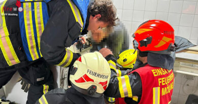 Am Eisteichweg in Ternitz kam eine Lenkerin von der Fahrbahn ab und stürzte mit ihrem Fahrzeug in das „Rohrbacherl“. Nach der Erkundung durch den Einsatzleiter wurde die Feuerwehr Ternitz-St.Johann mit dem Kran zur Unterstützung angefordert.