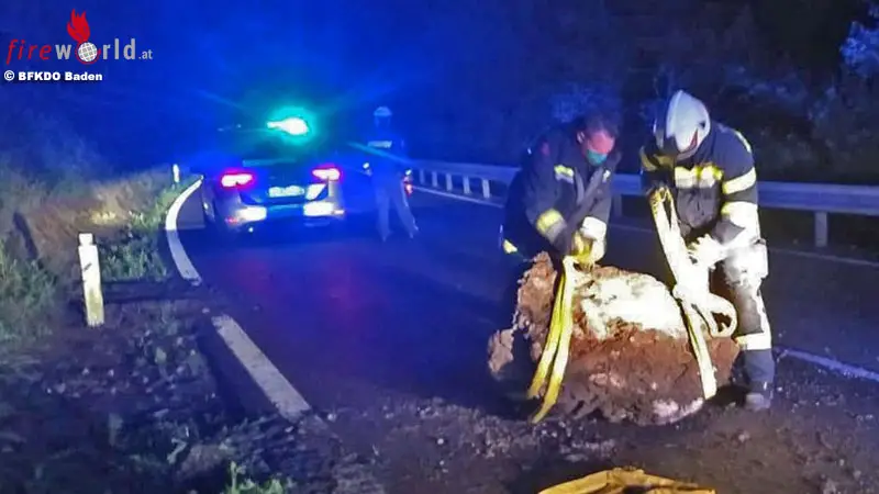 Gegen 23.15 Uhr wurde die Feuerwehr über die Feuerwehr-Bezirksalarmzentrale Baden von der Polizei und Straßenmeisterei zur Unterstützung angefordert. Die alarmierte FF Heiligenkreuz konnten den schweren Felsbrocken mit einem Ladekran von der Fahrbahn bergen. Zum Glück kam niemand zu Schaden. Auf diesem Straßenabschnitt wird auf die Steinschlag Gefahr hingewiesen.
