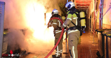 Noch während des Einsatzes in Halingen erreichte die Kreisleitstelle ein weiterer Notruf: Am Kösterskämpchen sollte direkt an dem Gebäude eines Elektronikmarktes ein Reifenstapel in Brand geraten sein.