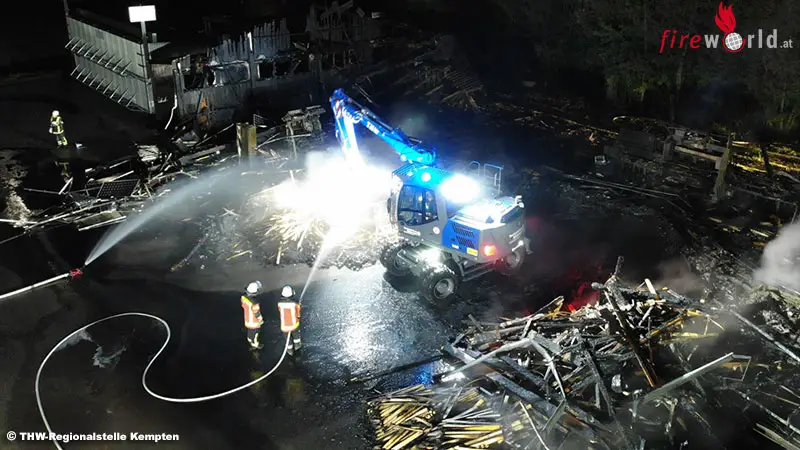 So auch die Helferinnen und Helfer aus dem THW-Ortsverband Memmingen, der mit seinem Drohnen-Trupp und der Fachgrüppe Räumen Unterstützung bei der Brandbekämpfung leisten konnte.Die Flammen schlugen bereits aus dem Dach der Produktionshalle, die sehr starke Rauchentwicklung war kilometerweit zu sehen. Die Feuerwehren konnten ein Übergreifen der Flammen auf die weiteren, in der Nähe befindlichen Fertigungsstätten verhindern.