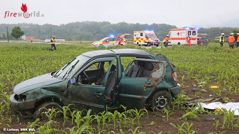 Der Kleinwagen gereit deshalb ins Schleudern, kam nach rechts von der Fahrbahn ab, traf einen Begrenzungspfosten, überschlug sich dann mehrmals in der angrenzenden ebenen Wiese und im Feld, riss ein Verkehrszeichen nieder und kam schließlich schwer beschädigt zwischen jungen Maispflanzen rund 20 Meter von der Bundesstraße entfernt wieder auf den Rädern stehen.