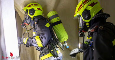 Zum Einsatz: Mit ca. 40 Einsatzkräften wurde die erforderliche Brandbekämpfung aufgenommen. Neben der direkten Brandbekämpfung unter Atemschutz wurden Logistikeinheiten alarmiert. Diese Einheiten versorgten die Großschadenstelle mit Löschmitteln und feuerwehrtechnischen Geräten. Dabei werden mobile Abrollbehälter eingesetzt, um eine möglichst autarke Aufbaustruktur vor Ort für die Einsatzkräfte sicherzustellen. Beispielsweise können so die Atemschutzgeräte direkt am Einsatzort wieder mit notwendiger Atemluft befüllt werden. Neben der Berufsfeuerwehr wurden auch Kräfte der Freiwilligen Feuerwehren und Kräfte des THW eingesetzt.