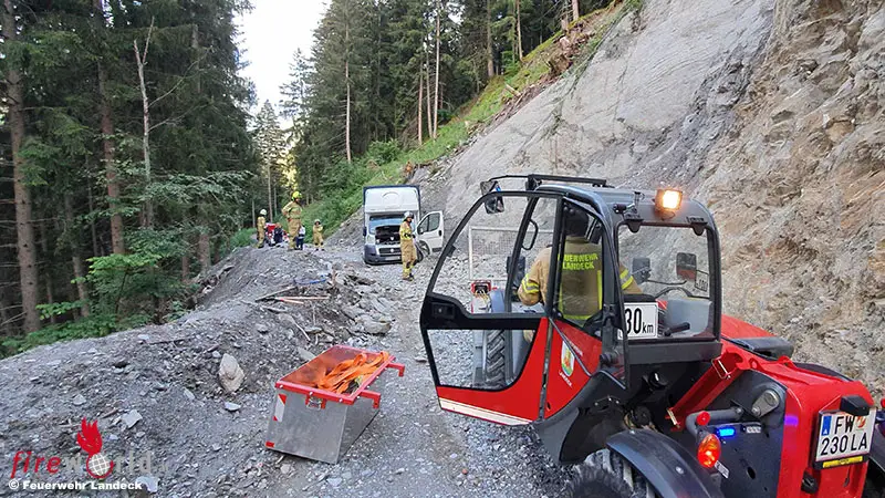 LANDECK (TIROL): Am 22. Juni 2020 wurde die Feuerwehr Landeck gegen 19:00 Uhr von der Polizei zu einer Hilfeleistung alarmiert. Ein rumänischer Lenker mit seinem Kleintransporter blieb auf einer sehr unwegsamen und nur mit Allrad Fahrzeugen befahrbaren Forststraße stecken.