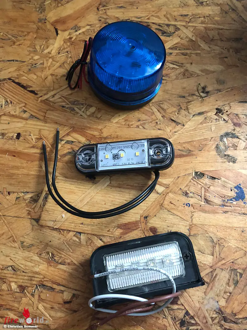 Dann ging es an die erforderlichen Scheinwerfer, für die er eine LED-Nummernschildbeleuchtung verwendet. Die Rückleuchten bestehen aus Lkw-Seitenmarkierungsleuchten. Die Spannungsversorgung derselbigen kommt aus dem bordeigenen Akku. Ebenso ist ein Leistungs-Reed-Kontakt verbaut, der die Beleuchtung bei der Einfahrt in die Ladestation automatisch abschaltet. Ein manueller Schalter ist ebenfalls verbaut, damit man die Beleuchtung auch abschalten kann.