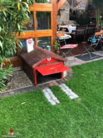 Eine Garage musste natürlich auch sein. Man kann den einzigartigen Feuerwehr-Rasenmäher-Roboter doch nicht in der prallen Sonne oder gar im Regen stehen lassen. So war es Anfangs ein kleiner Schuppen, in den der Roboter einfahren konnte. Aber das war wohl weder Ben noch Christian genug. Also folgte der nächste Schritt: der Ausbau zum Feuerwehrhaus samt automatischen Tor.