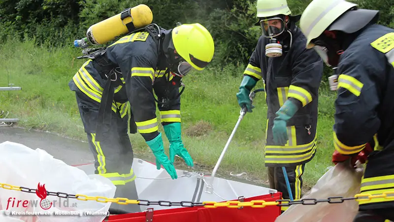 Beim Beladen eines Sattelaufliegers mit dem Gefahrgut „Organisches Peroxid“ sind drei Kanister mit je 30 Liter Inhalt beschädigt worden und in den doppelten Boden des Aufliegers gelaufen. Da dieser Stoff umweltschädlich ist, wählte der Betreiber den Notruf und setzte die Einsatzkräfte in Marsch. Im ersten Angriff der Einsatzkräfte wurde die Einsatzstelle mit Bindemittel abgestreut, um ein weiteres Verbreiten der Gefahr zu verhindern. Parallel wurde mit Steckleitern ein Not-Dekontaminationplatz errichtet. Während der Erstmaßnahmen wurde von der Einsatzleitung entschieden, die Führungsgruppe des Gefahrgutzuges des Landkreises Rotenburg zu alarmieren.