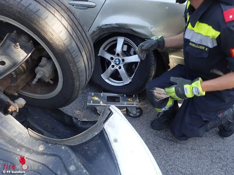 Nach Sperre der Hauptstraße durch die Polizei konnte an die Bergung der beiden Fahrzeuge gegangen werden. Zunächst wurde bei dem stehenden Pkw die Batterie abgeklemmt. Danach konnte mit Hilfe eines Wagenhebers ein Rangierroller unter den linken Hinterreifen platziert und der Wagen zur Seite geschoben werden.
