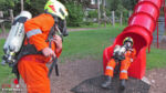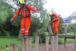 Im örtlichen Motorik-Park wurde das Geschick der Atemschutzträger auf den Prüfstand gestellt. In voller Atemschutzausrüstung galt es den Hindernisparcours zu absolvieren – eine wahre Herausforderung, die von den Geräteträgern vollste Konzentration, Gleichgewichtsgefühl und Körperbeherrschung erforderte. Und das alles mit dem eingeschränkten Sichtfeld der Atemschutzmaske und dem Pressluftatmer am Rücken …
