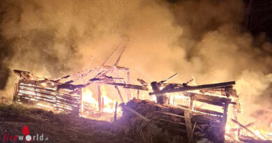 Durch einen schnellen und entschlossenen Löschangriff konnte dies verhindert werden. Eine Vielzahl an Notrufen bei der Integrierten Leitstelle ließ von Anfang an erkennen, dass ein größerer Einsatz beginnen wird. Beim Eintreffen der ersten Feuerwehrkräfte waren die Flammen bereits durch das Dach einer ca 200 Quadratmeter großen Scheune zu erkennen. Sofort wurde das direkt angrenzende Wohngebäude geräumt. Mit mehreren Löschrohren wurde zeitgleich eine Riegelstellung aufgebaut und damit die drohende Ausbreitung des Feuers auf das Wohngebäude verhindert.