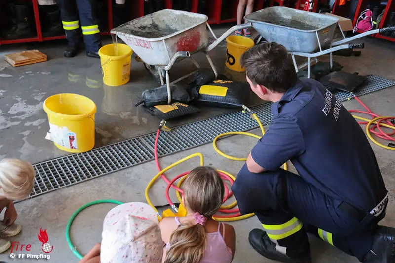 Weiter ging es im Programm mit der Vorführung des Impulslöschverfahrens IFEX, das von den Kameraden der Feuerwehr Linden erklärt wurde. Mit dem Stichwort „UHPS“ wurde das Löschsystem der Feuerwehr Schulleredt vorgestellt und den interessierten TeilnehmerInnen erklärt. Auch ein Geschicklichkeitsspiel, bei dem Eimer, mithilfe des geschickten Einsatzes von Hebekissen, befüllt werden mussten, durfte an diesem Vormittag natürlich nicht fehlen. Da die Ferienpassaktion im Feuerwehrhaus der Feuerwehr Linden stattfand, wollten wir den TeilnehmerInnen natürlich auch die Möglichkeit bieten die anderen Standorte der Feuerwehren der Gemeinde Andorf zu besichtigen.