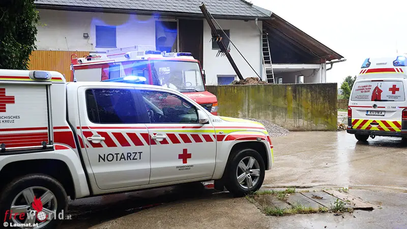 Oö: Drehleiter, Höhenretter und Rettungsdienst nach Sturz am Dachboden in Nußbach im Einsatz