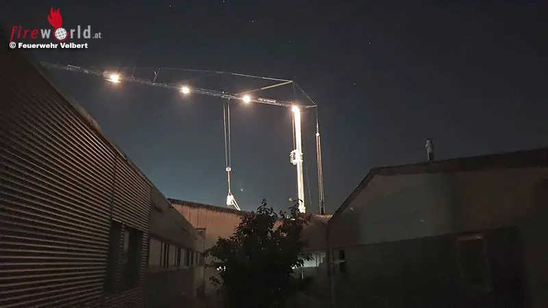 Zur Installation der erforderlichen Mess-Spiegel öffnete die Bergungsgruppe aus Velbert die Wände an mehreren Stellen mit der Rettungssäge sowie Brechwerkzeugen. Gearbeitet wurde dabei aus dem Korb der Velberter Drehleiter und unter Atemschutz. Die Velberter THW-Fachgruppe Schwere Bergung brach außerdem mit einer Betonkettensäge sowie Hammer und Meißel ein Loch in die rückwärtige Hallenwand, durch das Einsatzkräfte der Feuerwehr einen anders nicht erreichbaren Brandherd im hinteren Hallenbereich löschen konnten, ohne die Halle zu betreten.
