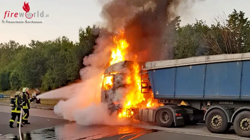 DORTMUND (DEUTSCHLAND): Um kurz vor 6 Uhr morgens des 7. August 2020 bemerkte der Fahrer eines mit Klärschlamm beladenen Lkw einen Defekt an seinem Reifen. Umgehend lenkte er sein Fahrzeug auf den nahe gelegenen Parkplatz „Kleine Herrenthey“ auf der A2, Fahrtrichtung Hannover. Nachdem er gehalten hatte bemerkte er plötzlich eine starke Flammenbildung an seiner Zugmaschine, rettete sich selbst unverletzt aus seinem Fahrerhaus und alarmierte die Feuerwehr.