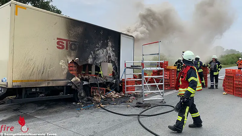GYHUM (DEUTSCHLAND): Gegen 12:05 Uhr des 14. August 2020 wurde der Feuerwehr- und Rettungsleitstelle in Zeven über Notruf ein brennender Lkw auf der A1 Fahrtrichtung Hamburg zwischen den Anschlußstellen Bockel und Elsdorf gemeldet. Daraufhin wurden die Feuerwehren Gyhum, Elsdorf und Zeven zur Einsatzstelle alarmiert.