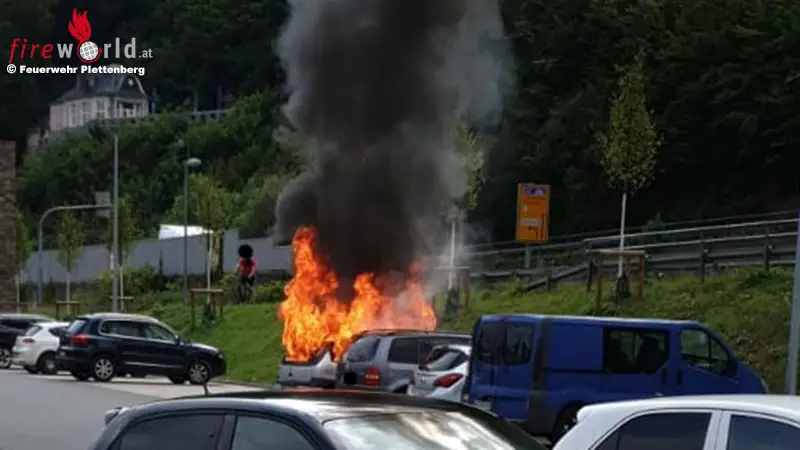 PLETTENBERG (DEUTSCHLAND): Am Montag, 24. August 2020, gegen 16:30 Uhr wurden die Kräfte der Feuer- und Rettungswache zu einem Pkw-Brand auf den Parkplatz des P-Centers an der Bahnhofstraße alarmiert. Bei Eintreffen brannte ein Auto bereits in voller Ausdehnung und das Feuer griff auf ein daneben stehendes Auto über.