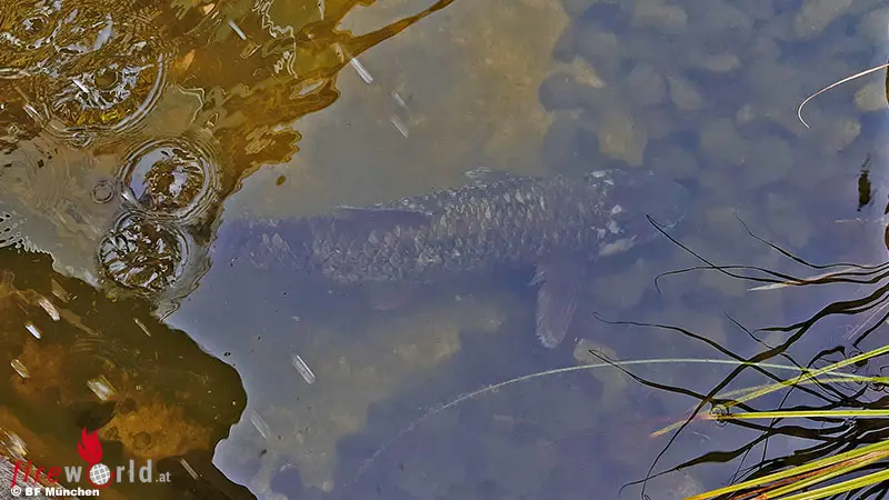 Anwohner bemerkten am Dienstagvormittag, dass ein Fisch im Niedrigwasser heftig herumschlug und nur noch zum Teil mit Wasser bedeckt war. Sie baten daraufhin die Feuerwehr um Hilfe. Das Kleinalarmfahrzeug der Feuerwache Riem fing den Fisch ein und transportierte ihn in einem großen Bottich zur Feuerwache. Um die Art eindeutig bestimmen zu können, wurde nicht nur ein Kollege mit Angelschein zu Rate gezogen, sondern auch das Jagd- und Fischeimuseum um eine Einschätzung gebeten. Nun stand zweifelsfrei fest: Es handelt sich um einen betagten Graskarpfen. Da diese Tiere aber nicht als heimisch gelten, wurde er im Anschluss im hauseigenen Zierteich, der sich um die Feuerwache schlängelt, eingesetzt. Hier kann er nun beruhigt sein Leben mit anderen Karpfen genießen.