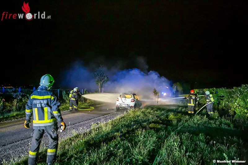 KREMS AN DER DONAU (NÖ): Am 31. August 2020, kurz vor 23.00 Uhr, meldete ein Jäger über den Feuerwehrnotruf 122, dass sein Fahrzeug auf der Stratzinger Straße brenne. Die Alarmzentrale alarmierte darauf die Kremser Feuerwachen Gneixendorf und Hauptwache, deren Einsatzkräfte rasch mit mehreren Löschfahrzeugen ausrückten. Ebenso wurden die Polizei und das Rotes Kreuz Krems zur Sicherheit der Einsatzkräfte verständigt.