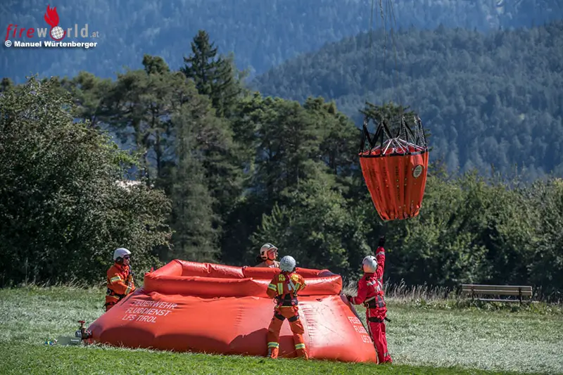 Bei bestem Flugwetter übten die Feuerwehr-Flughelfer der Bezirke Innsbruck-Land & Reutte und die Bezirkszentrale Innsbruck-Land gemeinsam mit den beiden Bundesheer Hubschraubern Agusta Bell 212 und „Alouette“ III und ihren Besatzungen am vergangenen Samstag, 5. September 2020, in Wildermieming zahlreiche Waldbrand-Szenarien.
