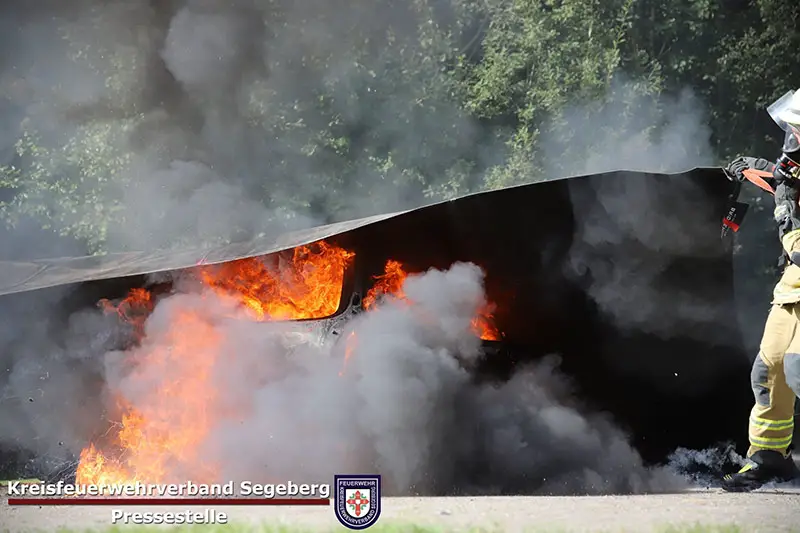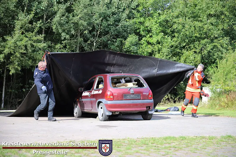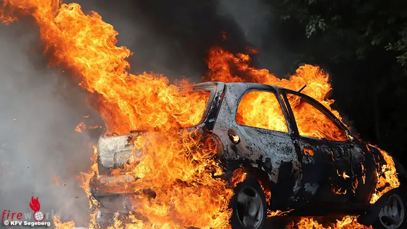 Die Ausbilder des Kreislehrgangs „Atemschutzgeräteträger“ unter der Leitung von Fabian Caspers führten anschließend die Löschwirkung der Decke mit realem Feuer vor, bei dem ein Auto in Brand gesteckt wurde.