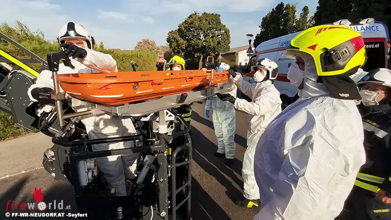 Nö: Drehleiter-Assistenz-Einsatz für verletzten Covid-19-Patienten in Wr. Neudorf