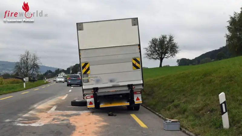 Kurz vor 12:30 Uhr fuhr ein Chauffeur mit seinem Sattelmotorfahrzeug auf der Kantonsstraße von Büron Richtung Triengen. Dabei verlor der Sachentransportanhänger auf der linken Seite beide Räder der Doppelbereifung. Während ein Rad die Gegenfahrbahn überquerte und nach ca. 100 Meter im Wiesland zum Stillstand kam, rollte das zweite Rad am Fahrzeug vorbei und kam am rechten Straßenrand liegend zum Sillstand. Verletzt wurde niemand.