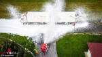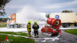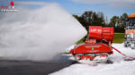Ist der Einsatz von Schaum notwendig, kann der Löschroboter jederzeit auf Schaum umgeschaltet werden. Die Wurfweite von Schaum beträgt ca. 35 m. Besonders auf den Einsatz von Schaum wurde bei der Schulung in Mooskirchen eingegangen. So wurden die richtige Dosierung der verschieden zur Verfügung stehenden Schaummittel getestet und das Einschäumen von großen Objekten, wie in Übungsbeispiel ein Lkw-Gespann, geübt.