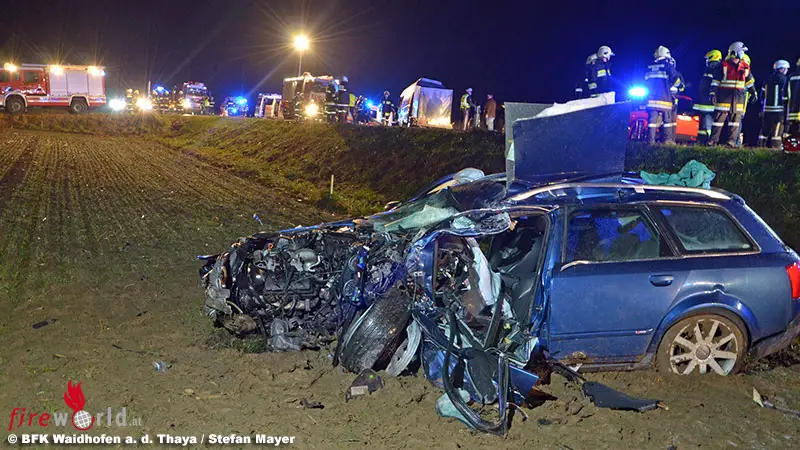 VITIS (NÖ): Auf der B2 zwischen Vitis und Großrupprechts kollidierten Sonntagabend, 1. November 2020, ein Pkw und ein mit 15 Personen besetzter Kleinbus. Der folgenschwere Unfall forderte zwei schwer und drei leicht verletzte Personen. Der Pkw-Lenker musste von den Einsatzkräften der Feuerwehr mit hydraulischen Rettungsgeräten aus dem Fahrzeug befreit werden.
