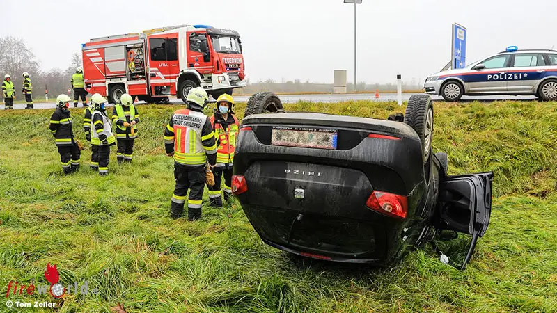 SPIELBERG (STMK): Zu einem Verkehrsunfall rückten 18 Mann der Feuerwehr Spielberg am 14. November 2020 aus. Aus bisher nicht geklärter Ursache kam gegen 11:20 Uhr eine Pkw-Lenkerin im Gemeindegebiet von Spielberg von der Straße ab und kam auf dem Dach liegend im Straßengraben zum Stillstand.