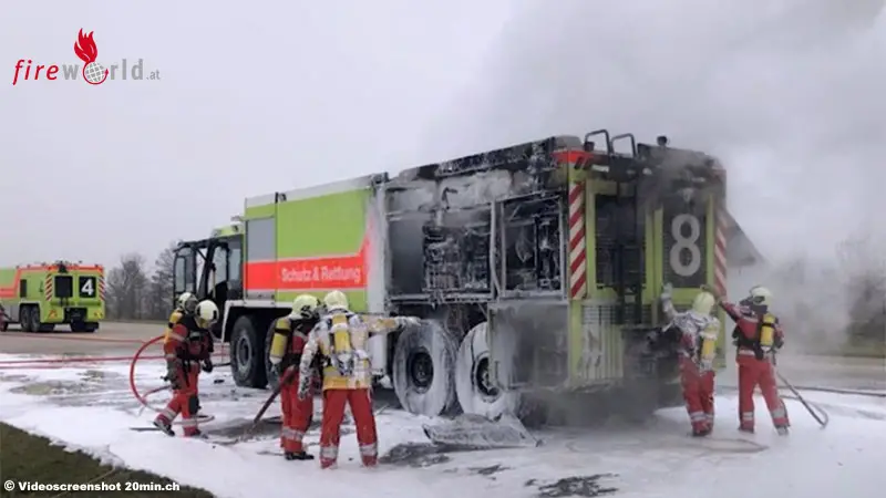 Schweiz: Zwei Jahre altes Flughafenlöschfahrzeug bei Übungsfahrt am Airport Zürich in Flammen aufgegangen