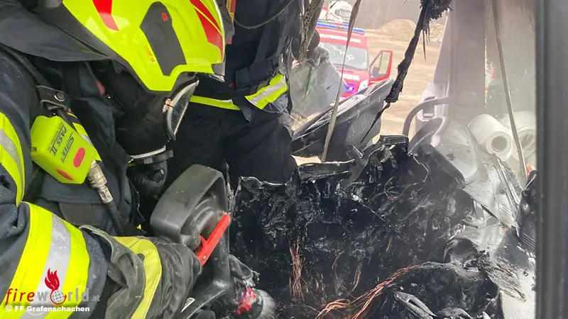Die Freiwillige Feuerwehr Grafenschachen übernahm beim Eintreffen die Brandbekämpfung. Der ausgerüstete Atemschutztrupp führte mit einer Löschleitung unter schwerem Atemschutz die Brandbekämpfung durch. Nach wenigen Minuten waren die Flammen gelöscht und die Glutbrandbekämpfung mit Unterstützung unserer Wärmebildkamera erfolgreich durchgeführt.