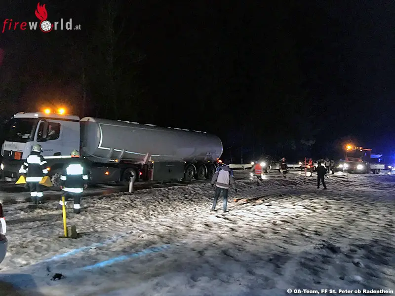 SANKT PETER OB RADENTHEIN (KTN): Am 7. Dezember 2020 wurden die Feuerwehren Bad Kleinkirchheim und St. Peter ob Radenthein gegen 18.14 Uhr mittels Sirenenalarm unter dem Alarmstichwort „T2 – Fahrzeug sichern über 3,5t“ zu einem technischen Einsatz auf die B88 im Bereich St. Peter alarmiert.