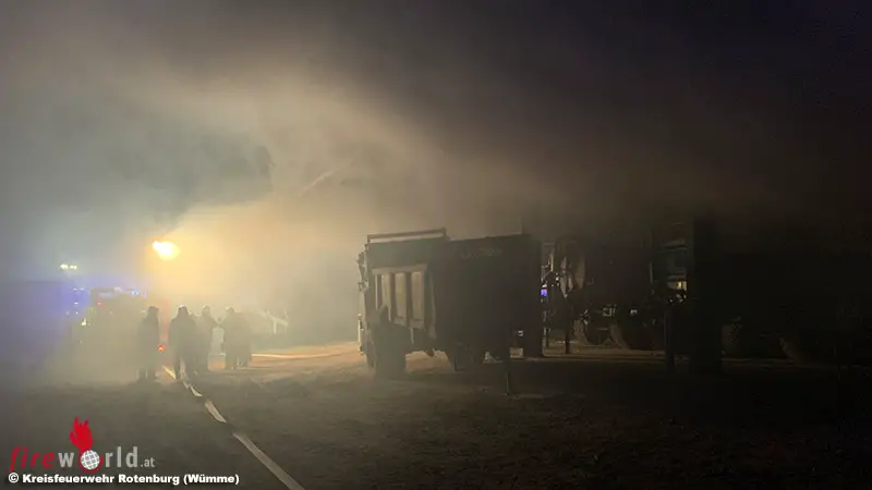 ELSDORF (DEUTSCHLAND): Am frühen Sonntagmorgen, 13. Dezember 2020, um 4:41 wurden die Feuerwehren Elsdorf, Gyhum, Frankenbostel, Hatzte-Ehestorf, Volkensen-Rüspel-Nindorf und Zeven zu einem Feuer in einem landwirtschaftlichen Gebäude in den Erlenweg nach Elsdorf gerufen. Dort sollte nach ersten Meldungen eine Scheune brennen.